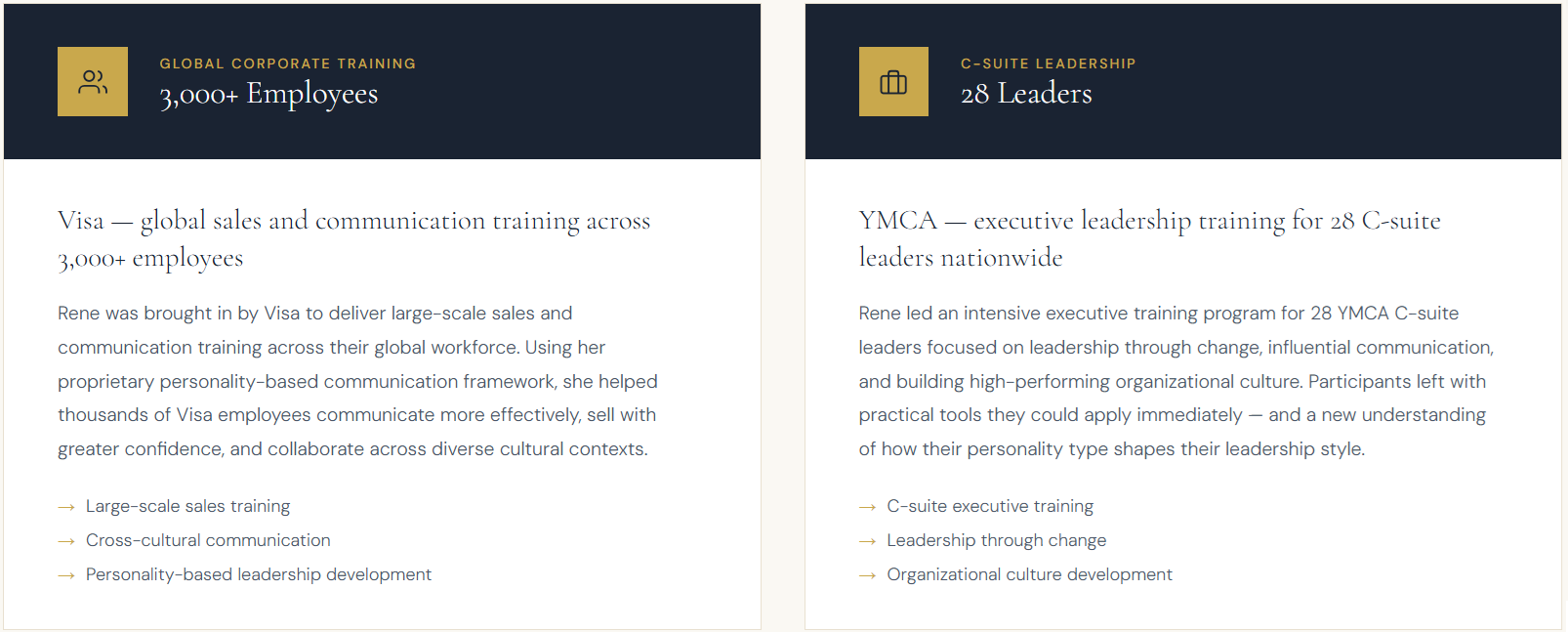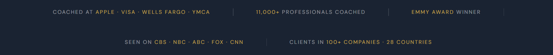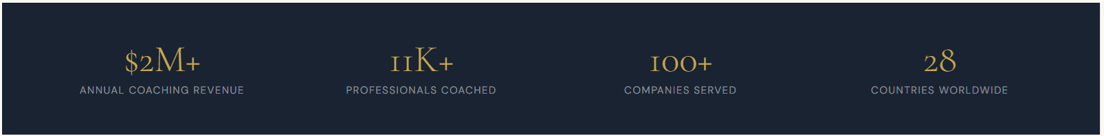 “I’ve coached 11,000+ professionals, delivered 200+ keynotes in 18 countries, and generated over $2M annually in coaching revenue. But what makes me different isn’t the numbers — it’s that I’ve lived what I teach.”